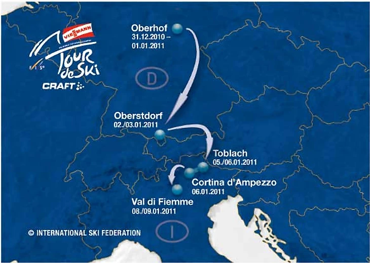 4 места проведения. Швейцарский Валь-Мюстаир, немецкий Оберстдорф и итальянские Тоблах и Валь-ди-Фьемме. Расстояние между последними двумя — 120 км