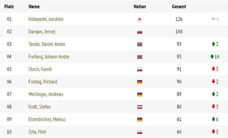 Важно отметить, что Ерней Дамьян стал четвёртым самым возрастным прыгуном, выигравшим соревнование Кубка мира. В нашем случае это произошло в возрасте 34 лет, 5 месяцев и 29 дней. Старше него победителями становились только вечный Нориаки Касаи, не менее известный своим спортивным долголетием Таканобу Окабе и товарищ по сборной Словении Роберт Кранец.