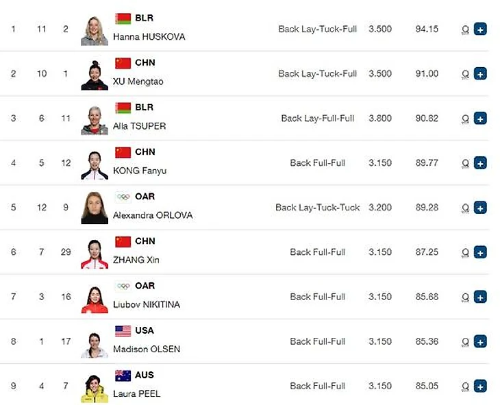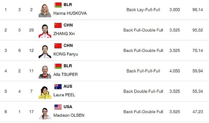 Алла Цупер вновь заявила более сложный прыжок, чем у конкуренток (только у китаянки Ксю Ментао была такая же сложность прыжка). Анна Гуськова заявила прыжок чуть проще, но выполнила его хорошо и самое главное удачно приземлилась. Это позволило беларуском занять место в первой шестёрке и выйти в главный финал с 4-м и 5-м результатами.
