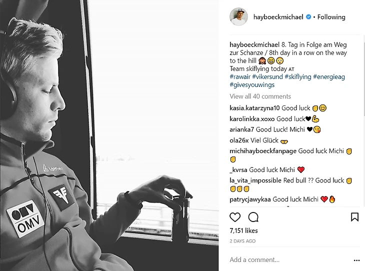 Михаэль Хайбёк в Инстаграме: «Восьмой день подряд едем на трамплин».