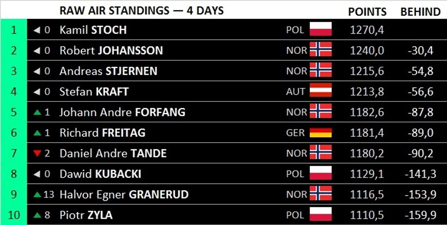 Из интересного - обострение борьбы за третье место: Крафт вплотную приблизился к Стьернену. И ещё один ограниченный фактором командного турнира - Пётр Жила. Но, в отличие от Гранеруда, он выступал в одном из "командников".