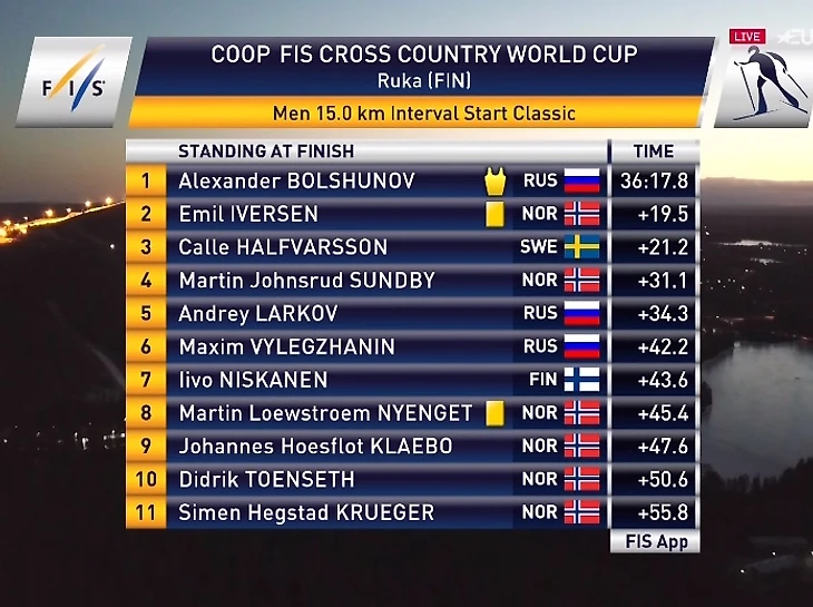 По горячим следам мужской 15 км классической гонки с раздельным стартом в Руке (Финляндия) (25.11.2018)