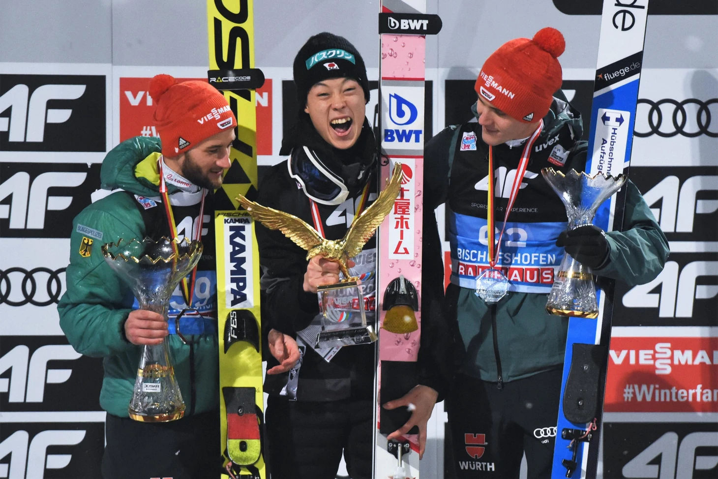 Вот уже 16 лет немецкие прыгуны не могут разбить проклятие Турне четырёх трамплинов: Свен Ханнавальд по-прежнему остаётся последним немцем, который смог увести домой «Золотого орла». Для главного тренера немецкой сборной Вернера Шустера это достижение остаётся одной из немногих незакрытых целей в тренерской карьере, хотя в этом году его подопечные опять были близки к цели – но Инсбрук который год подряд сдаваться не хочет. Именно на «Бергизельшанце» Маркус Айзенбихлер проиграл решающую схватку Рюёю Кобаяши, хотя и удержал вторую позицию в зачете Турне. А после Бишофсхофена арифметические подсчеты сложились удачно и для его товарища по команде Штефана Ляйе, который занял четвёртое место на трамплине имени Пауля Ауссерляйтнера, но благодаря осечке соперников смог подняться в зачете Турне с пятого на третье место. И если для самих спортсменов этот расклад очень хороший, то герр тренер наверняка хотел бы видеть иное. «Мы снова, к сожалению, проиграли выдающемуся прыгуну», – с горечью резюмировал бундестренер, которому теперь придётся оправдываться за своё будущее ещё активнее, ведь слухи о том, что Австрийский лыжный союз пытается переманить Шустера обратно домой, ползут после окончания Турне с удвоенной силой.