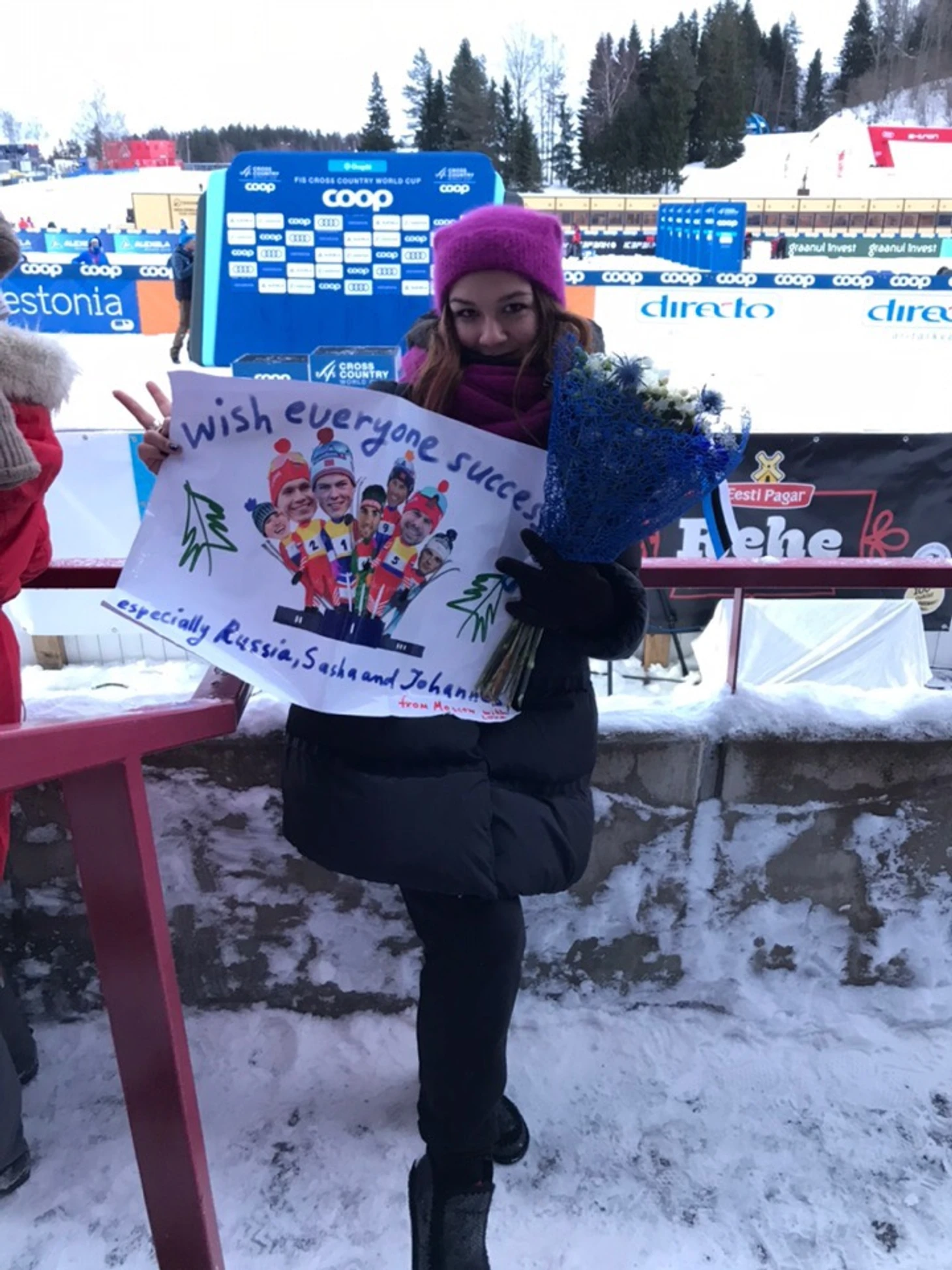 А тем временем публика плавно перемещается на трибуны, спринт же. На трибунах наших флагов мало, море эстонских, много финнов. Большунова любят все, не только свои, как и Клэбо. Пеллегрино у публики не в чести почему-то. У девушек болеют вообще за всех, каждое падение расстраивает, и лишь одно все же заставило улыбнуться, было красиво:) но все равно обидно за Ретивых. А уж как я расстроилась, когда Саша упал. Но случилось так, как я и хотела в итоге. Награждение дам и кавалеров, изо всех сил кричали Наташе и Саше. Йоханнес идет бросать цветы, я трясу свой плакат, Йоха целится (чет я не думала о цветах, поэтому стояла и только смотрела), но букет плавно летит к нам, я кидаю плакат и хватаю за хвостик букет. Параллельно со мной его хватают две высокие эстонские девы. И вот тут я узнаю себя в состоянии аффекта, я держу букет, они держат)) я решила сдать завоеванное, поэтому попросила сделать фото с букетом и отдать эстонкам. Обидно, конечно. Но что теперь, не драться же)