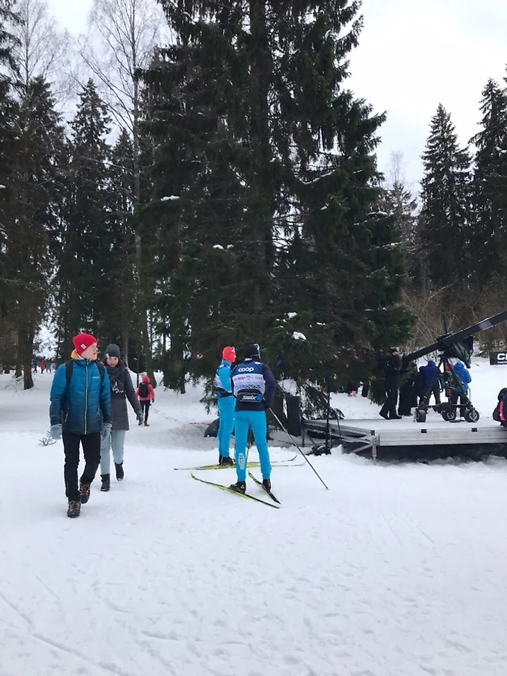 Квалификация, что ж, посмотрим. Пока еще особо не кричим, только изучаем, сзади нас прям на минутку Максим Вылегжанин встает посмотреть гонку. Вдоль трассы можно гулять, эстонцы почти не ограничивают ваше передвижение, ходит весь народ прям по трассе, где гонка пока не началась. Тут же стоят Денис Спицов и Алексей Червоткин) Слышу, Денис рассуждает, что такая камера и по шапке может дать (не дословно))). Тут же папа Клэбо и Йоха быстренько записывают влог так, будто стесняются) И Йоха бежит на жеребьевку. Бежит Йоха не по отдельной дорожке для спортсменов, где никто из зрителей не ходит, а бежит там, где все мы ходим. Клэбо играет на публику, но по-моему, Клэбо публику любит, ему публика не безразлична) Йоханнес худой и очень высокий, думала, он все ж пониже. И совсем юный, даже на свои 22 еле тянет.