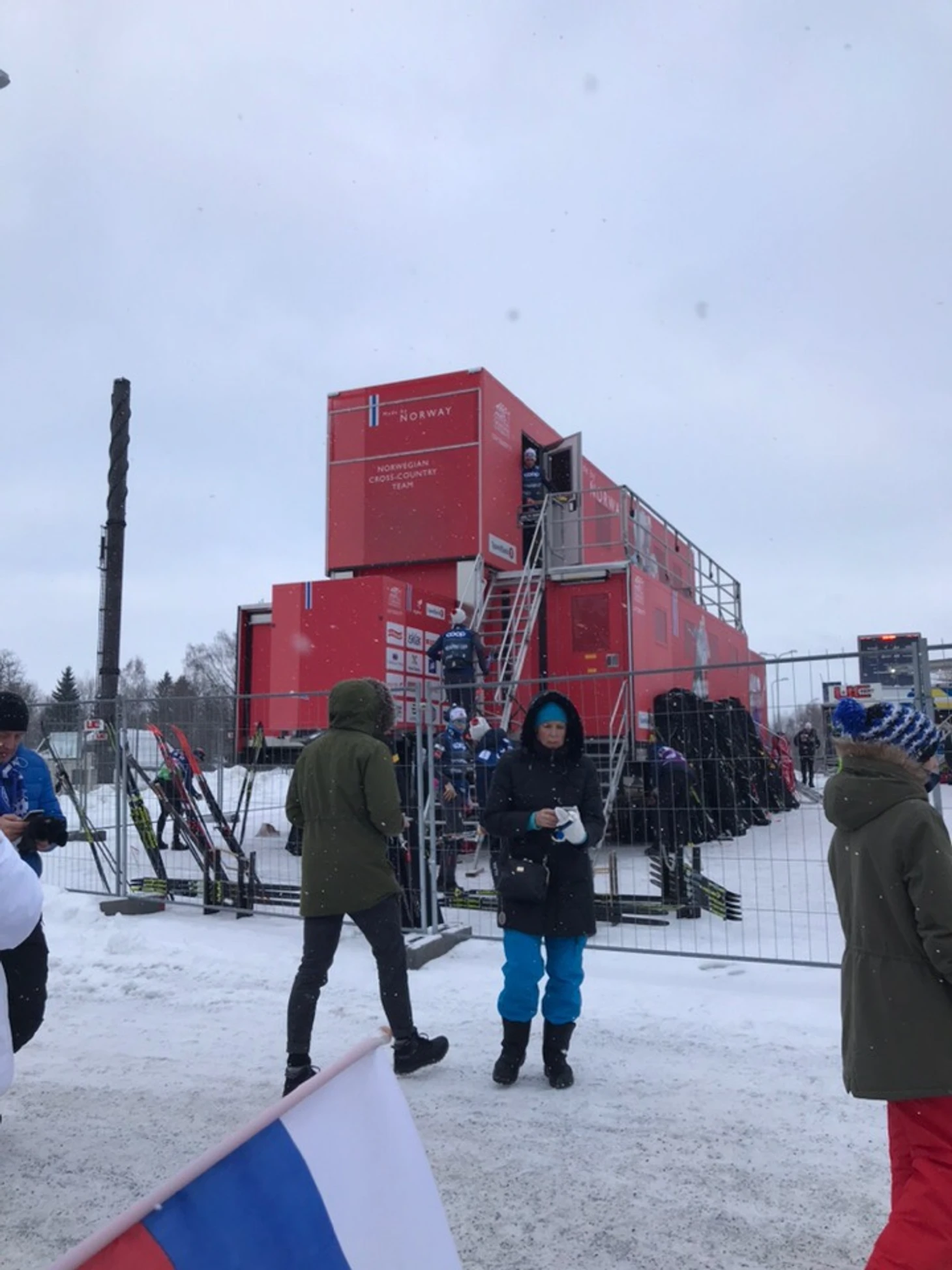 Представьте, идете вы на стадион, изучаете, что да как. И просто около выхода на трассу стоят трейлеры всех команд. Естественно, наш и норвежский на самых крутых местах. Вы просто решаете, что стоит постоять и посмотреть на автобусы. И вот кто-то в синей форме показался, взглянул на ваш флаг что ли, или просто идет какой-то довольный…погодите, я только и успела сказать маме, что идет Большуня на тренировку, правда, уходит в закрытую часть, только для аккредитаций. Ну, все, думаю, можно уезжать:D Посмотрели на трассе на всех наших, на итальянцев, да вообще на всех. Мимо вас то и дело бегают вниз-вверх спортсмены, тренеры и сервисмены вообще всех команд, ходит и Ю.В. Бородавко, и Маркус Крамер в своих огромных классных сапогах.