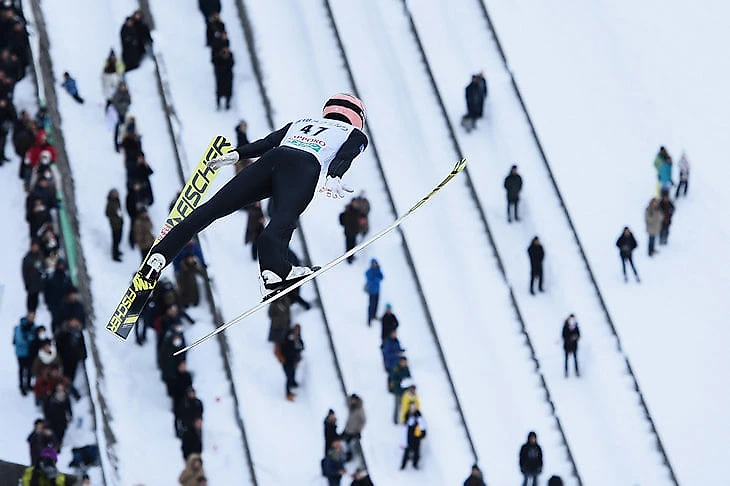 Чемпион мира, австриец Штефан Крафт, кажется, прыгает прямо на людей. Но это обман зрения – а все происходит в японском Саппоро.