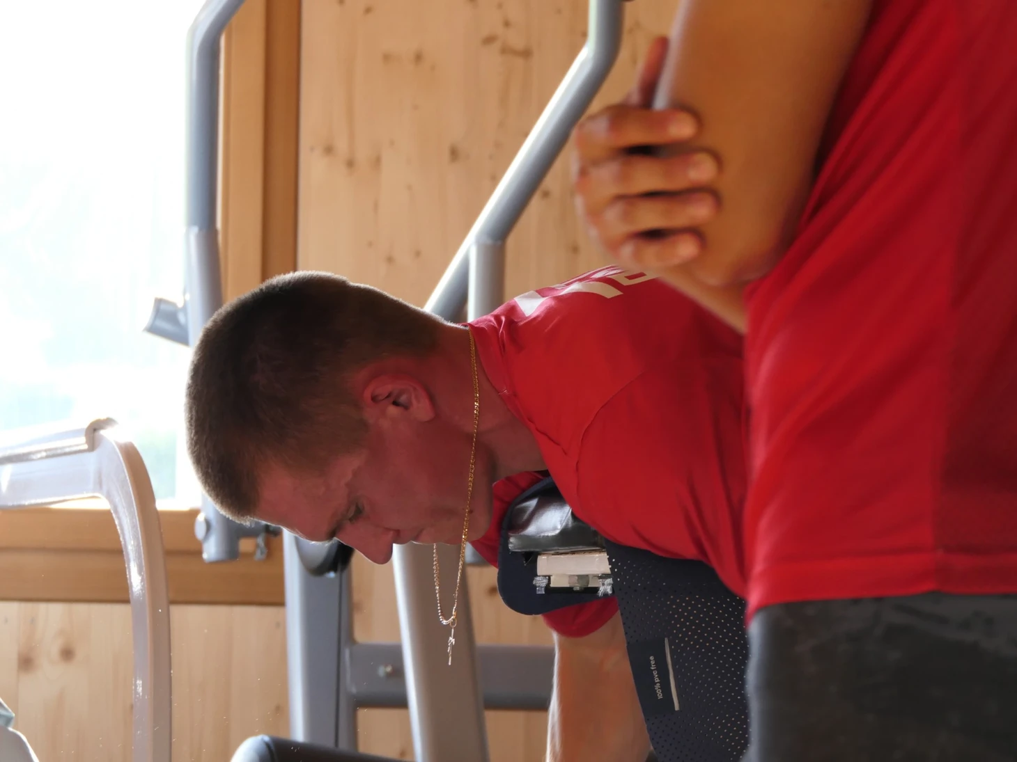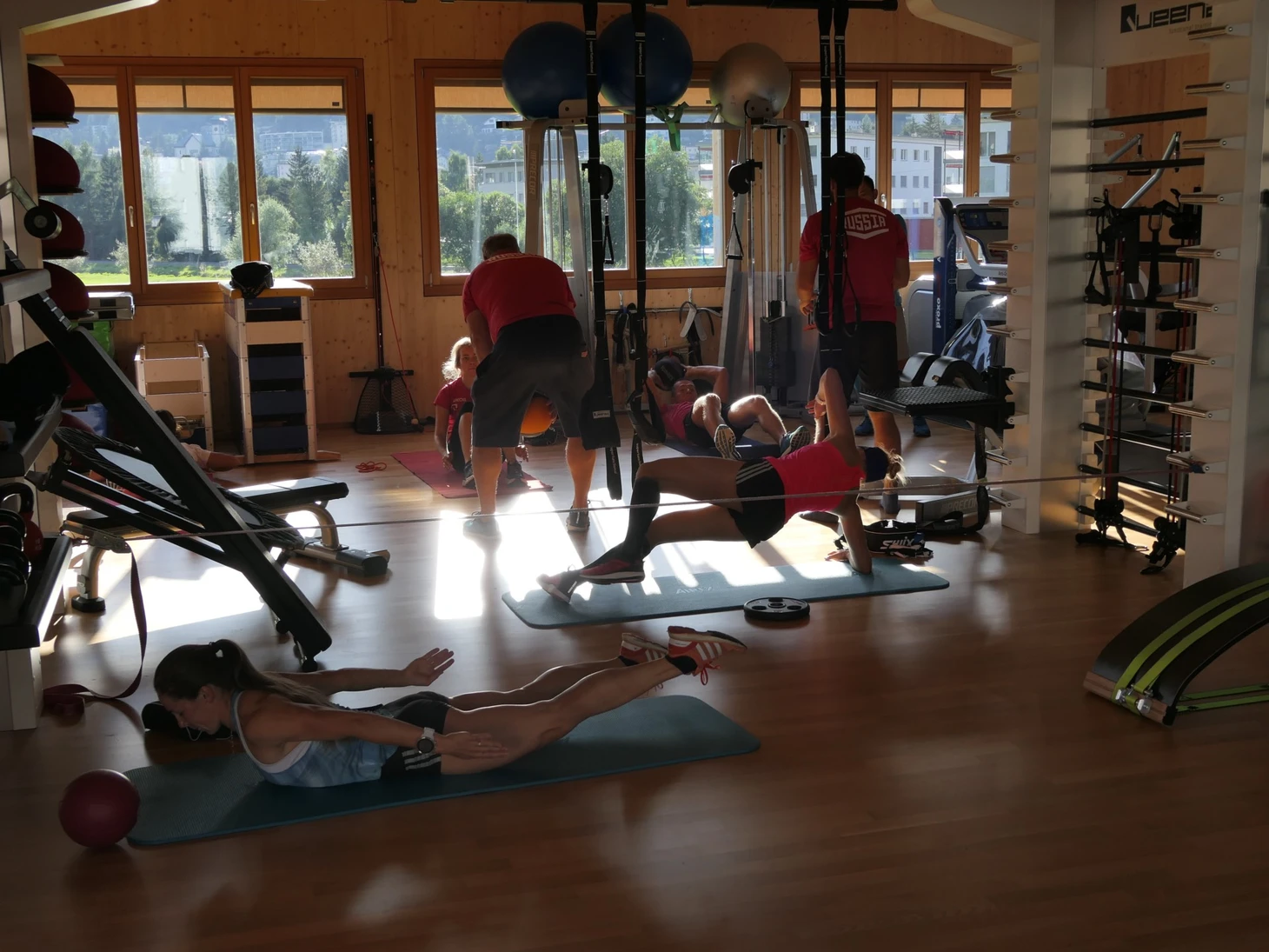 Тренажерный зал в «Колонья центре» не считается новейшим в области высоких технологий, но хорошо оборудован и имеет достаточно места для девятерых лыжников из группы Бородавко.