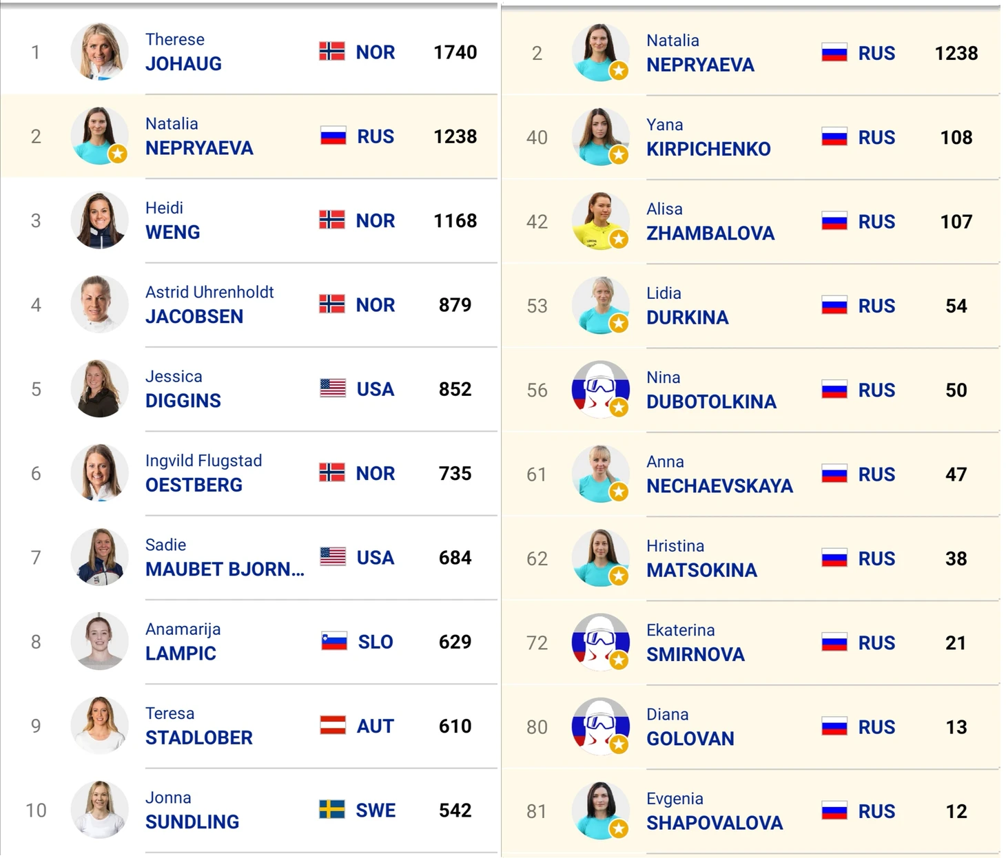 Неплохо для себя (для этого сезона) провела гонку Анна Нечаевская, расположившаяся на 21 месте. Яна Кирпиченко заняла 29, Алиса Жамбалова - 31, Алия Иксанова - 48, Диана Головань - 62. Екатерина Смирнова стартовала и пройдя первую половину дистанции (шла в 10 секундах от Непряевой) сошла. Причины неизвестны, будем надеяться, что все хорошо со здоровьем.