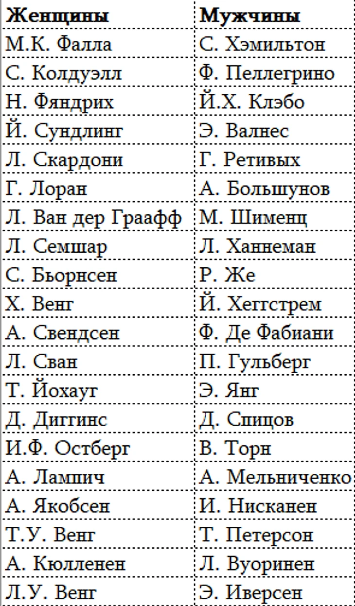 1. Й.Клебо 1-3. П.Гульберг 1-6. Ф. Пеллегрино
