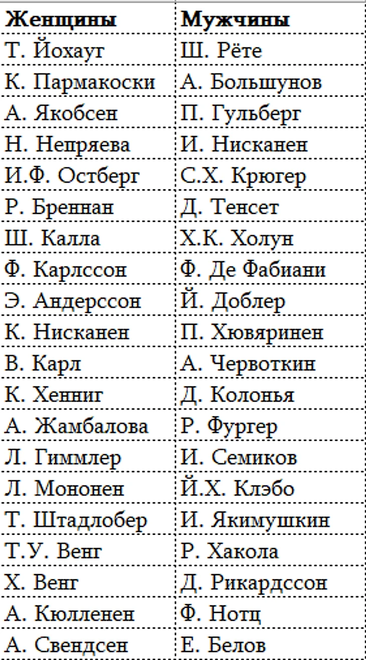 1. Т.Йохауг 1-3. Э.Андерссон 1-6. И.Ф.Остберг