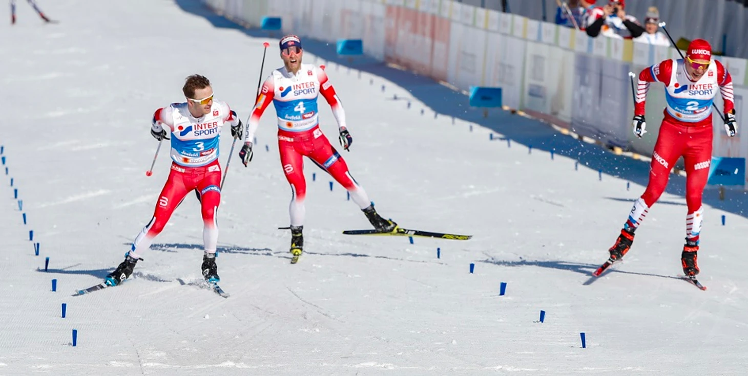 Чемпионат мира-2019, Зеефельд. На финише скиатлона Большунов (справа) уступает Рёте (слева) 0,1 секунды