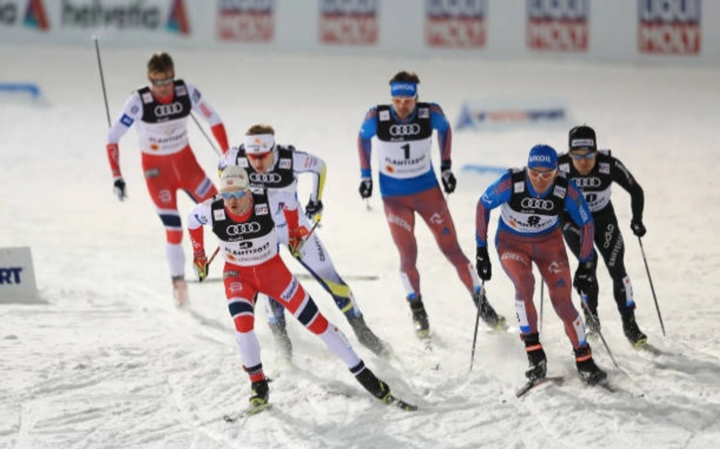 На чемпионате мира-2017 Большунов (№8) вышел на одну лыжню с гегемоном предыдущего десятилетия Петтером Нортугом (крайний слева). Для Нортуга этот чемпионат стал последним
