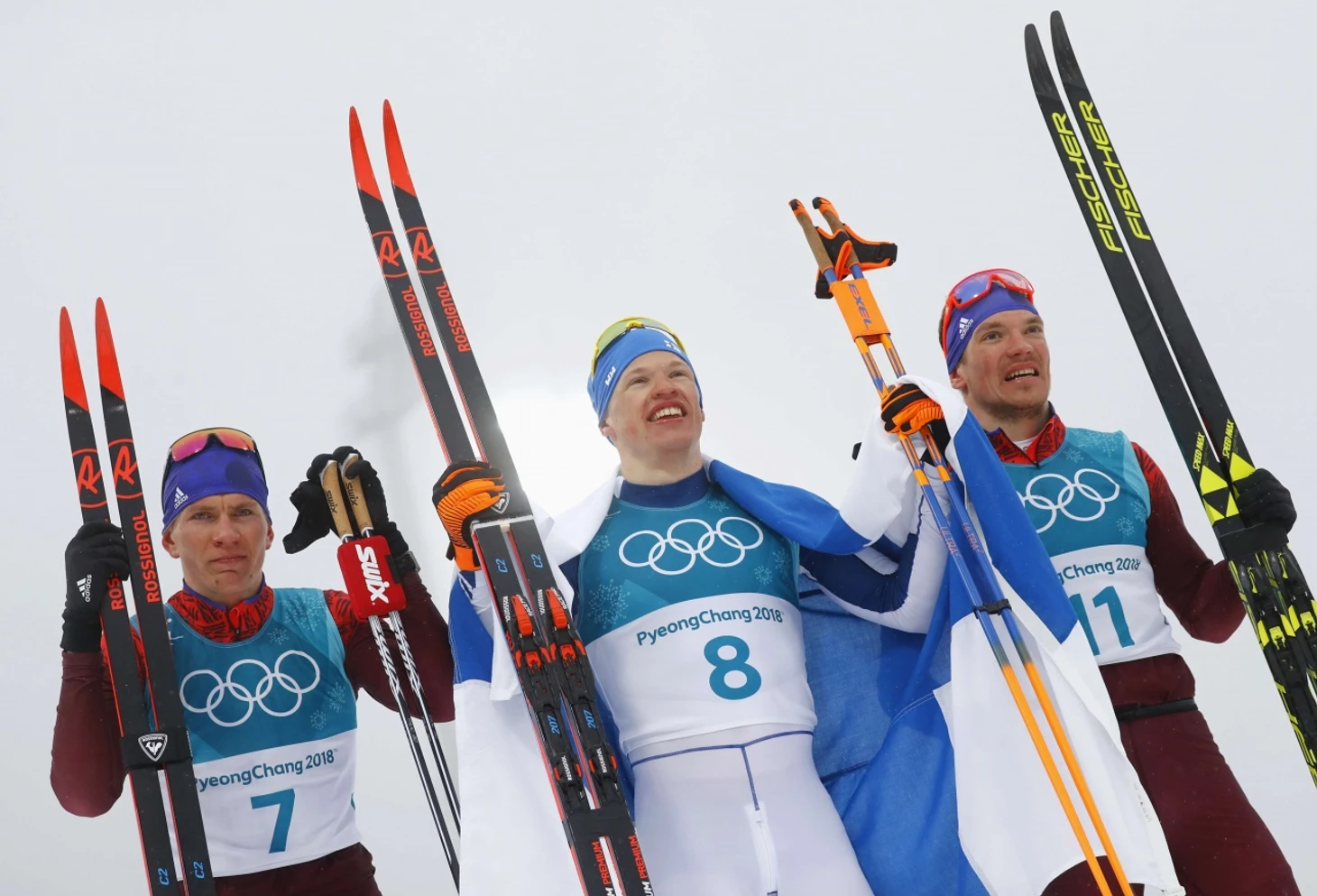 Олимпиада-2018, Пхенчхан, призеры марафона. Слева направо: Большунов, Нисканен, Ларьков