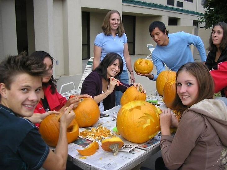Фото из личного архива П.Ермошиной. Типичное американское студенчество: студенты дружно готовятся к Хеллоуины, вырезая маски из тыкв. Полина в нижнем правом углу. University of New Mexico, Альбукерке, штат Нью-Мексико, США.