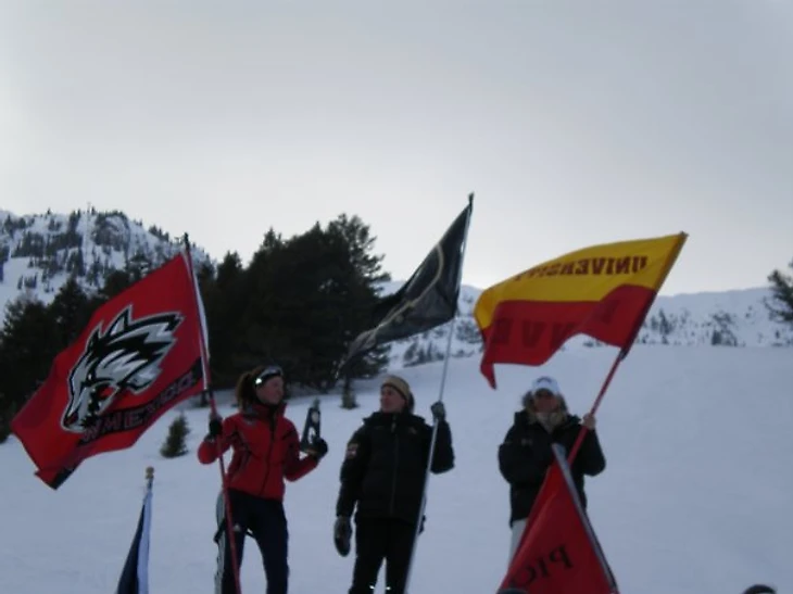 Фото из личного архива П.Ермошиной. Полина занимает второе место на университетском чемпионате США (NCAA). На награждение она выходит в форме своего университета и с флагом. На флаге изображён талисман Университета Нью-Мексико - волк, а точнее Лобос (волк по-испански, Нью-Мексико является пограничным штатом с Мексикой, поэтому тут мощная испаноговорящая диаспора). форма и флаг раскрашены в вишнево-серебряные цвета, являющиеся цветами Университета. Бозмен, штат Монтана, 7 марта 2008 года.