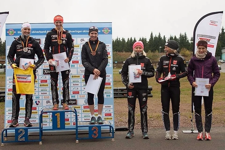 Фото из личного архива П.Ермошиной. Как говорит сама Полина, одной из её сильных сторон в лыжной подготовке является кросс, именно поэтому её и взяли тренироваться в сборную Германии, т.к. это один из компонентов, где она могла тянуть за собой немок. И вот россиянка занимает третье место на летнем чемпионате Германии по лыжным гонкам в кроссе. На второй ступени пьедестала почёта стоит Дениз Херманн, бронзовый призёр Олимпиады в Сочи по лыжным гонкам, чемпионка мира 2019 года, правда, уже в биатлоне. Рупольдинг, Германия, сентябрь 2013 года.