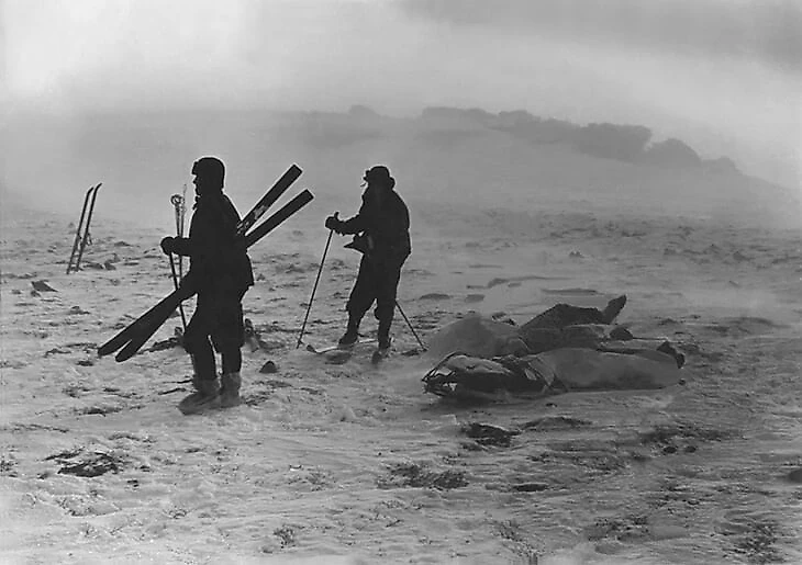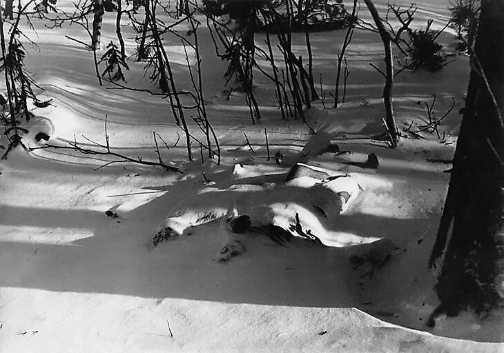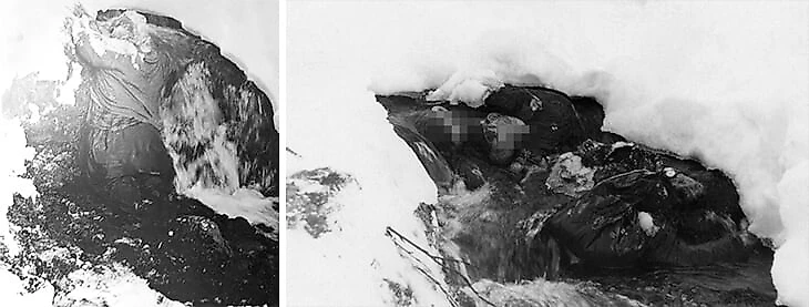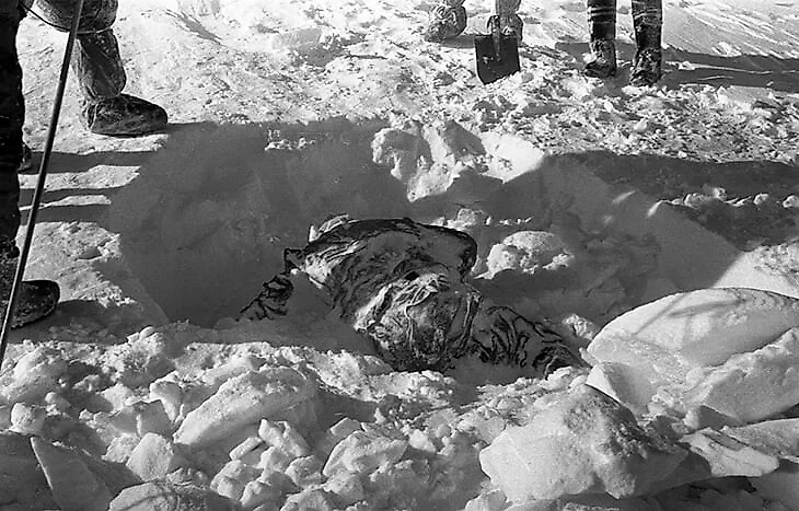 6. Еще одно тело нашли только спустя неделю под толстым слоем снега (15-20 см) в 150 метрах от Колмогоровой – это труп Слободина. Он тоже был тепло одет, на ногах – четыре пары носков и один валенок. Второй такой валенок остался в палатке. У Слободина – так же, как и у Колмогоровой – были следы крови из носа.
