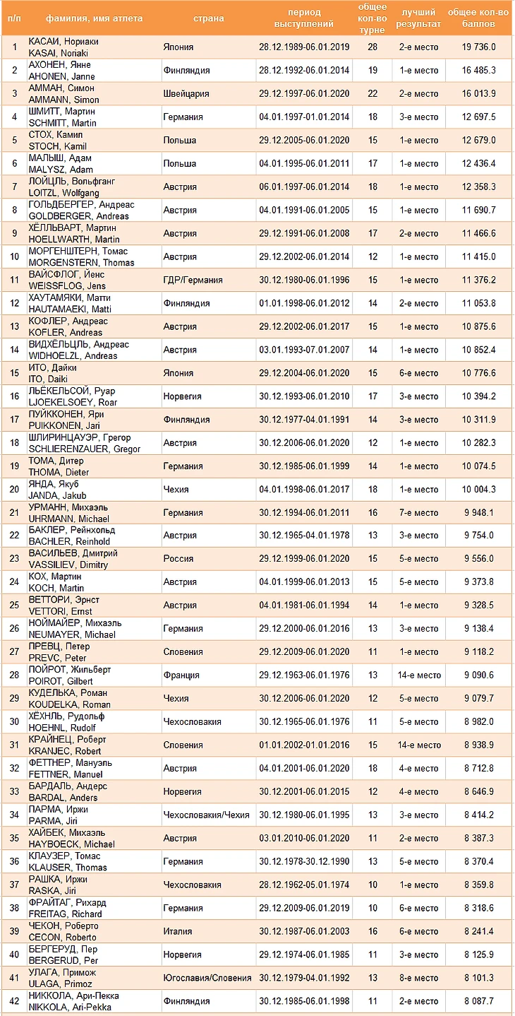 Лидером по числу сезонов, как и по сумме баллов является настоящий "железный самурай" - японец Нориаки Касаи, который за 28 сезонов набрал 19 736.0 баллов.