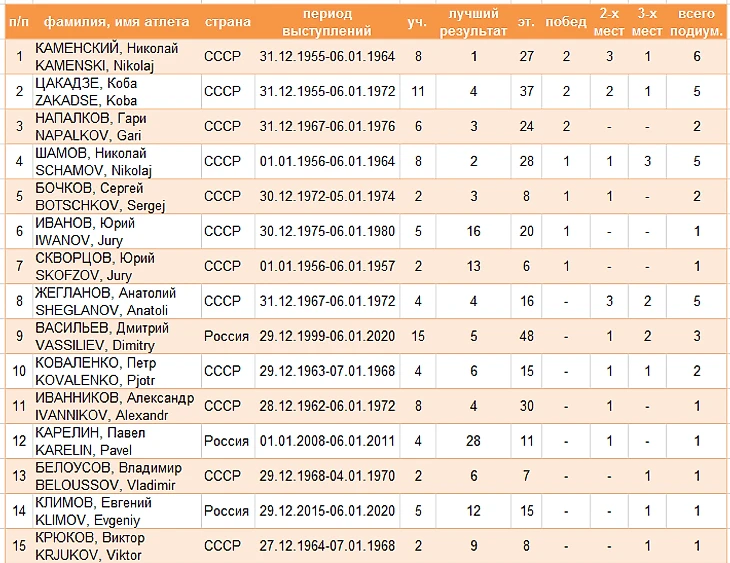 Теперь к "нашим" - к которым отнесу представителей СССР, России и других республик постсоветского пространства (среди участников турне отмечены представители следующих республик - Белоруссии, Казахстана, Киргизии, Эстонии и Украины). Всего в рамках турне в основных раундах приняло участие на сегодняшний день - 108 человек. В таблице приведены результаты, наиболее успешных, которые занимали призовые места на этапах турне. Таких в общей сложности, пока 15 спортсменов. Дополнительно приведены результаты по количеству участий в турне и лучшему результату в рамках общего зачета.