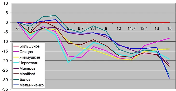 Белов и Мельниченко очень сильно начали и даже имели фору в несколько секунд перед Большуновым на первых трех километрах, далее на 2-м и 3-м круге тоже держали очень высокий темп, но 4-й сектор на каждом из кругов, особенно на последнем, был просто провальным. В сумме оба проиграли Большунову на данных секторах почти по полминуты.