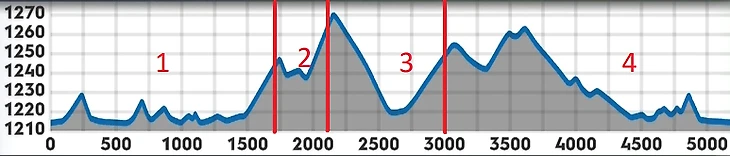 Круг длиной 5км поделен отсечками на 4 сектора: 1-й это длинный пологий участок с первой половиной большого подъема, 2-й это очень короткий спуск с пологим участком и вторая половина большого подъема, 3-й это крутой продолжительный спуск и еще один подъем, но уже не такой крутой, как предыдущие, 4-й это длинный спуск с коротким пологим участком.