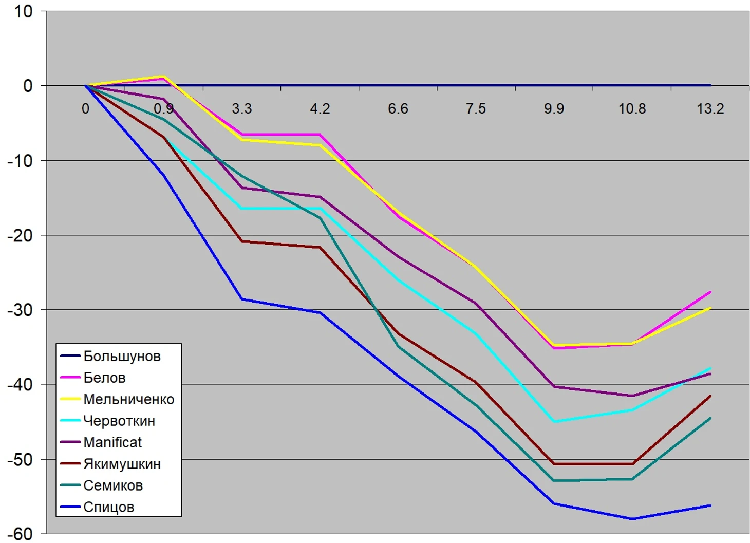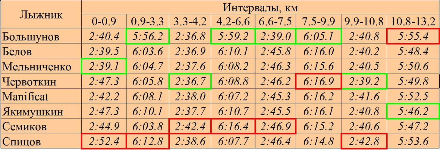 Что касается остальных, Спицов очень слабо начал и среди всех участников из таблицы показал худшее время, классика это не его. Очень удивил Мельниченко, показав 3-е время в гонке, и наоборот, Червоткин, по идее, который должен был бороться за подиум, в итоге на него не попал и показал ход хуже конькиста Андрея.