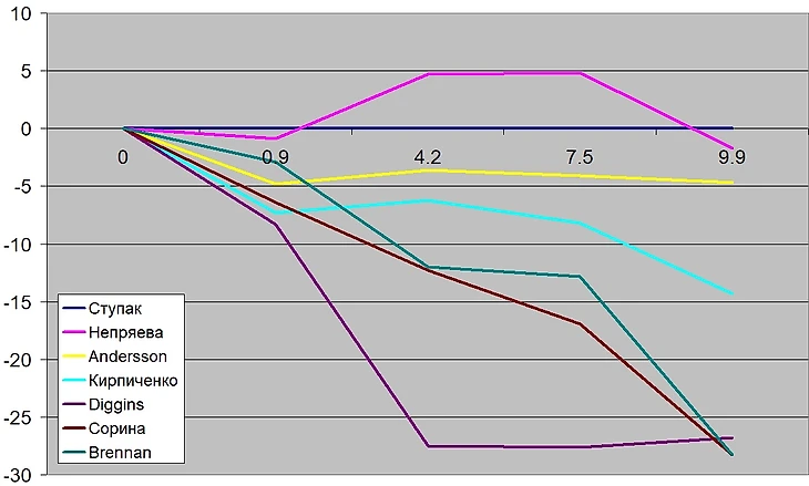 Сорина очень равномерно прошла трассу, видно по графику, что почти прямая линия, жалко, что при этом проигрывала постоянно.