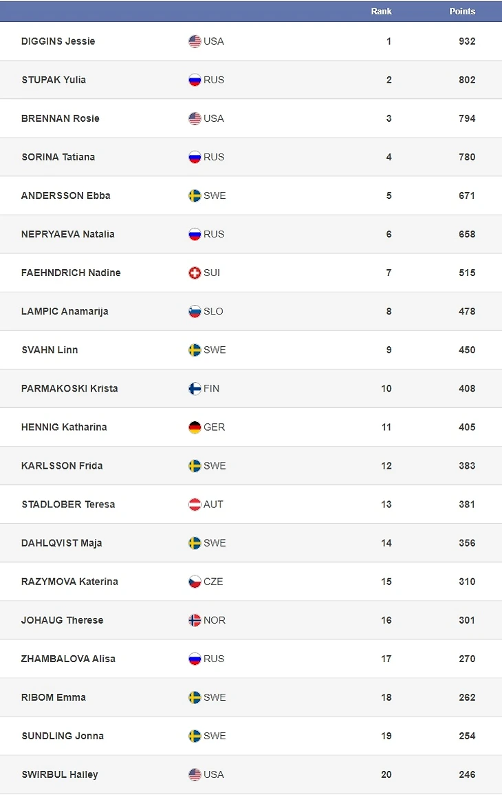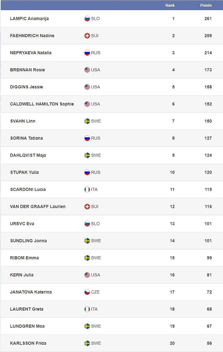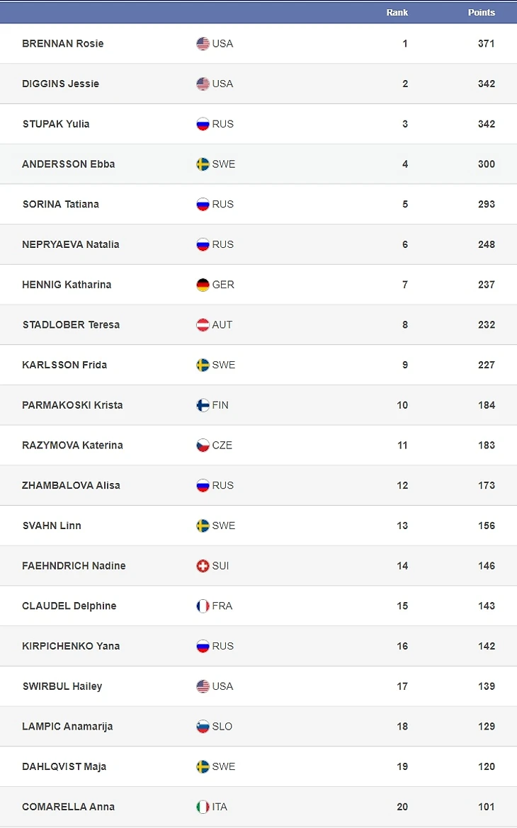 Спринтерский, дистанционный и общий зачеты у женщин приведены ниже: