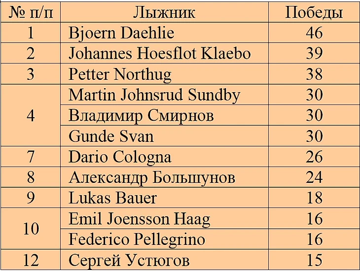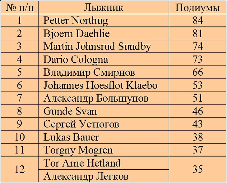 Так как последние 2 таблицы собирал по разным источникам, то огромная просьба поправить меня, если я указал неверное количество побед или подиумов у данных лыжников или кого то пропустил.