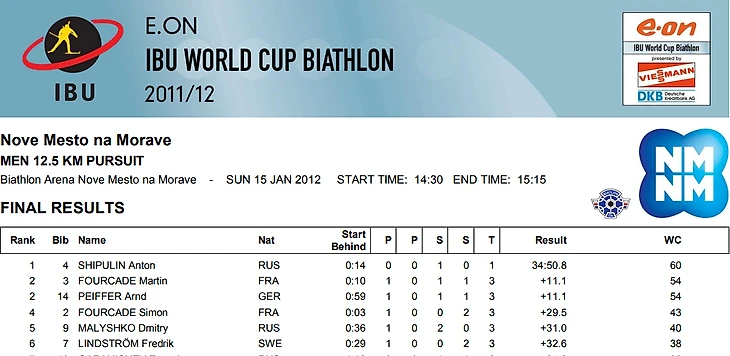 Финишной протокол гонки преследования в Нове-Место (2012). Сайт: https://ibu.blob.core.windows.net/docs/1112/BT/SWRL/CP05/SMPU/BT_C73D_1.0.pdf