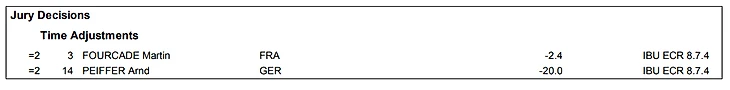 2.3.1 <...> Жюри соревнования назначает наказания за нарушения правил, указанных в отчетах РД/ТД, МС, должностных лиц соревнования и членов жюри соревнования, а также налагает наказания и назначает дисциплинарные меры в пределах своей компетенции. Помимо этого, жюри соревнования принимает решения относительно корректировок времени и в отношении ситуаций, возникающих на соревновании, которые не описаны в настоящих правилах или других публикациях IBU нормативного характера <...>