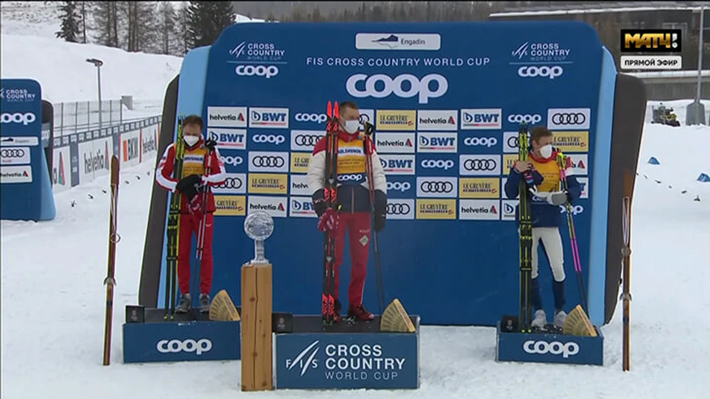 И вот наконец-то реальное награждение – это уникальные кадры: российский лыжник впервые в истории получает Кубок мира.