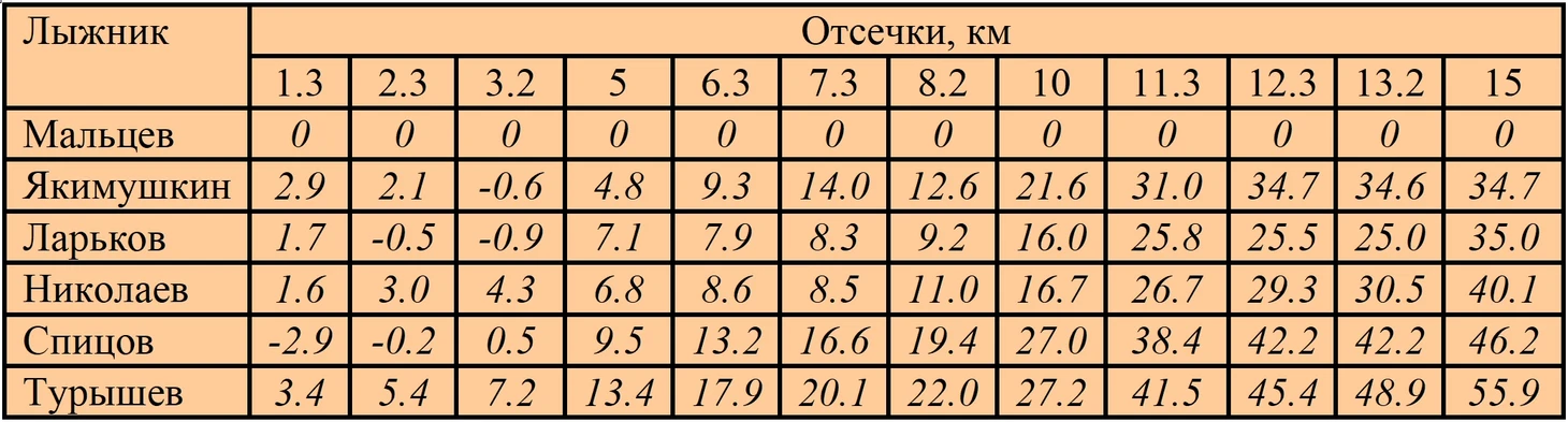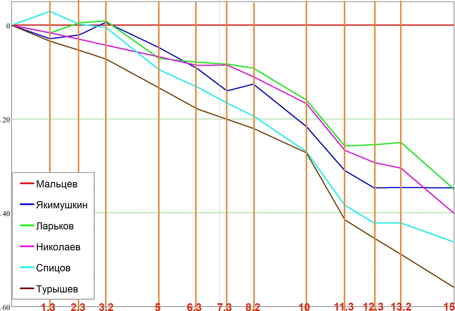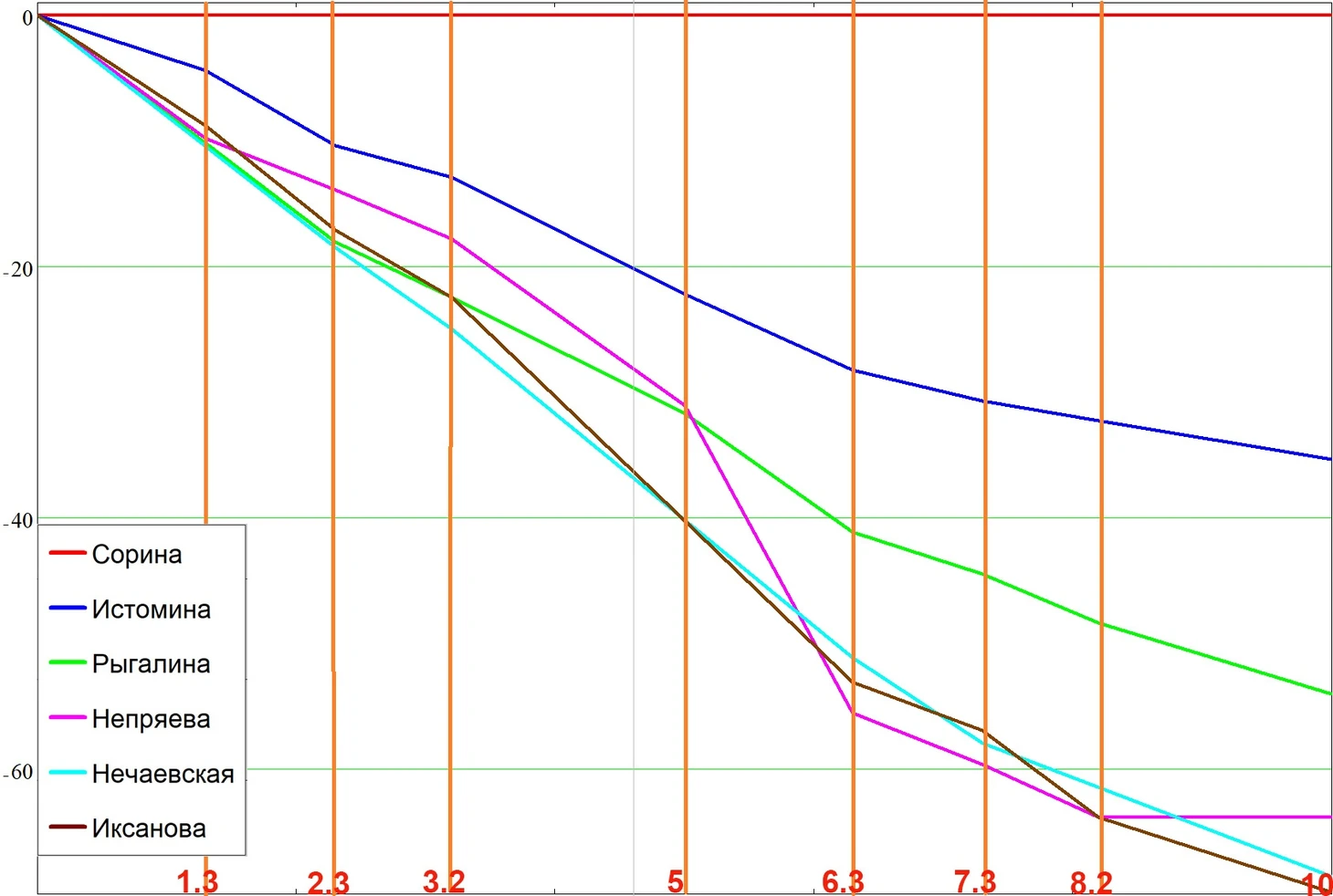 Показываю только графики и оставание по отсечкам, причем у некоторых спортсменов на нескольких отсечках по интерполяции, так как всех не показывали, плюс рельеф трассы тоже не смог найти.