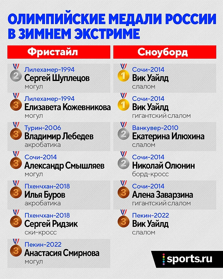• За всю историю Олимпиад у России всего два олимпийских золота в сноуборде и фристайле – оба в Сочи-2014 выиграл только что натурализованный американец Вик Уайлд.