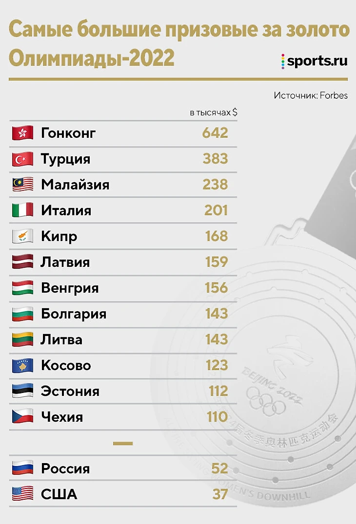 «Правительством принято решение о вознаграждении российских спортсменов по итогам выступления на Играх: за золотую медаль – 4 млн рублей, за серебряную – 2,5 млн рублей, за бронзовую медаль – 1,7 млн рублей», – говорил премьер-министр России Михаил Мишустин на заседании кабмина перед Пекином-2022. 4 млн рублей в пересчете на актуальный курс – чуть больше 53 тысяч долларов.