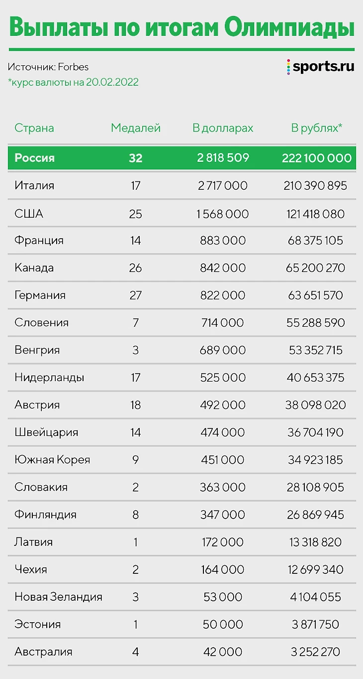 Кажется, причины низких расценок понятны. У топ-стран слишком много медалистов, поэтому награды ценятся не так, как в Гонконге. По суммарным выплатам Россия – лидер, Италия и США – в тройке.