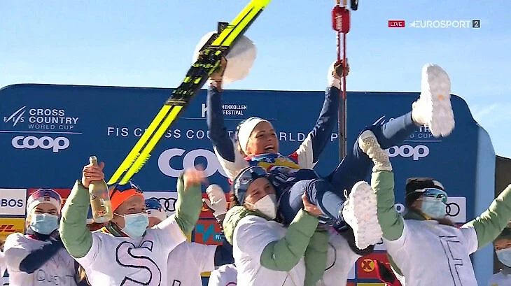 А затем наслаждалась сюрпризом от команды. Лыжники надели футболки с перечнем всех титулов Йохауг, забрызгали ее шампанским и спели We are the champions. Чемпионский глоток игристого.