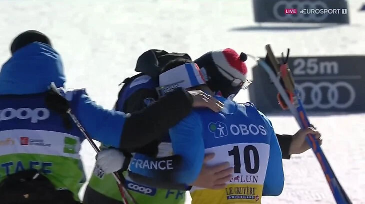 Команда праздновала историческую победу: Жув – первый француз, взявший глобус в лыжах. Да, речь о Малом глобусе, но при гегемонии России и Норвегии – это супердостижение. Уже после финиша Жув отпустил эмоции и почти заплакал, приветствуя трибуны.