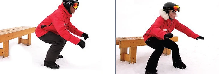 - По очередно на переднем и заднем канте: а) руки сзади в замке, выталкиваем таз вперед, держим Майкла Джексона (в голенях ощущение, что просто «упали» на языки ботинок), б) на переднем и заднем канте, по диагонали пересекая склон, приседаем, акцент на подкручивание таза.