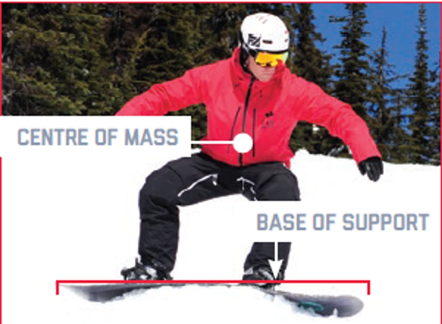 - Центр масс расположен над центром сноуборда, не сгибаться в тазобедренном суставе и не наклоняться вперед для балансирования. Таз на над центром сноуборда