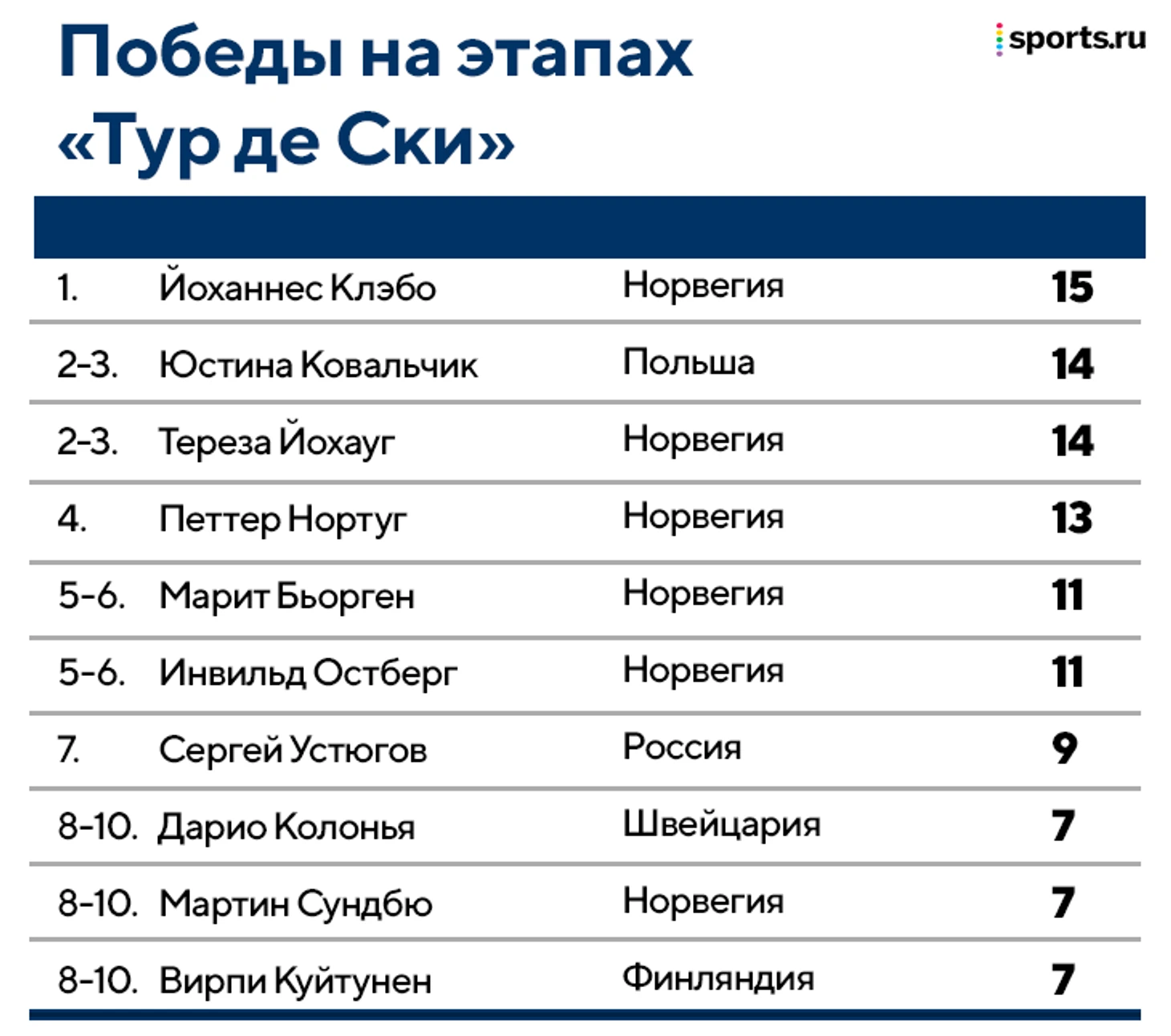 • Общий рекорд по победам делили Тереза Йохауг и Юстина Ковальчик. Норвежка добралась до 14 побед в 2020-м, Ковальчик – в 2013-м. У мужчин рекордсменом держался Петтер Нортуг – 13 побед к 2015 году. Клэбо опередил всех – теперь у него 15 побед, причем добился он этого всего за 4 неполных «Тур де Ски». У Нортуга, к примеру, на 13 побед ушло 9 «Туров».