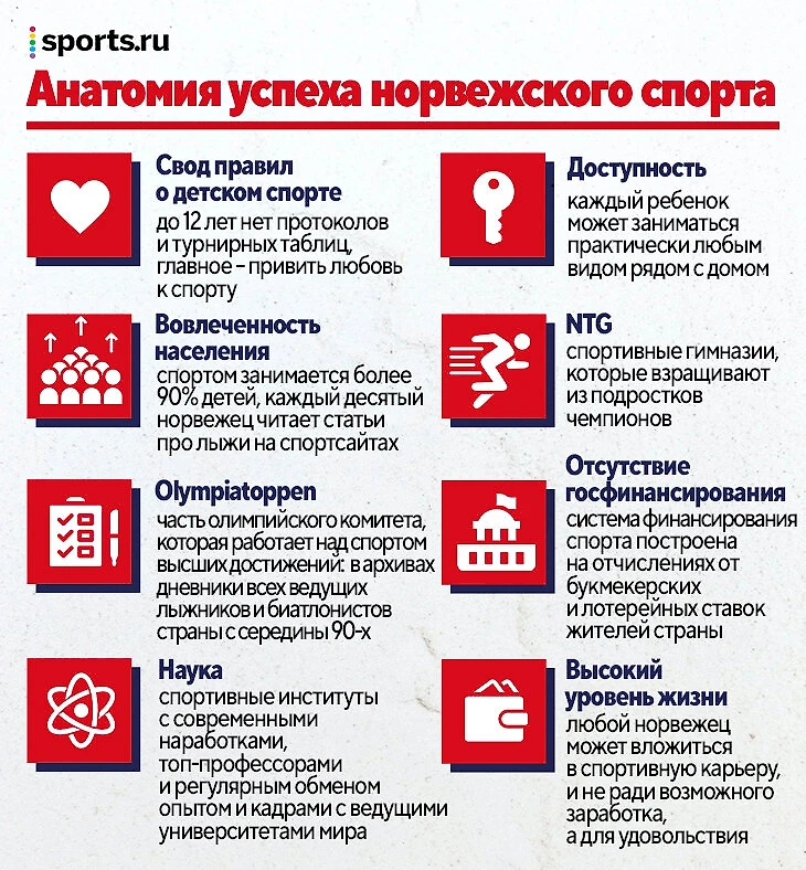 • Высокий уровень жизни / любой норвежец может вложиться в спортивную карьеру, и не ради возможного заработка, а для удовольствия