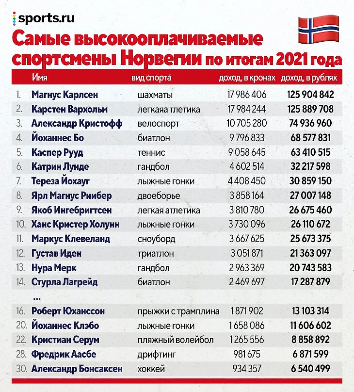 VG публиковало рейтинг самых высокооплачиваемых норвежских спортсменов за 2020 год. При формировании учитывался только доход, налог с которого уплачен в Норвегии. Поэтому в списке нет Холанда и других топ-футболистов – они платят налоги в странах, в которых играют.