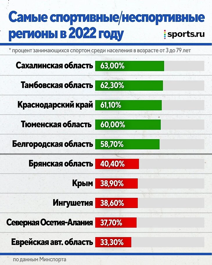 • Самым спортивным регионом страны стала Сахалинская область – здесь физкультурой и спортом по отчетам чиновникам занимаются 63% населения в возрасте от 3 до 79 лет. Хуже всего дела обстоят в Еврейской автономной области, где к регулярным занятиям спортом приобщилось всего 33,3%.