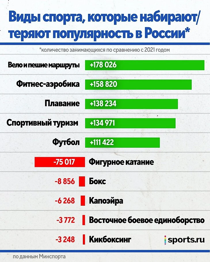 Главное удивление в антирейтинге теряющих популярность видов – ее возглавила фигурка, из которой за год куда-то исчезли почти 75 тысяч занимающихся. Также в упадке четыре вида единоборств – и это похоже на тенденцию.