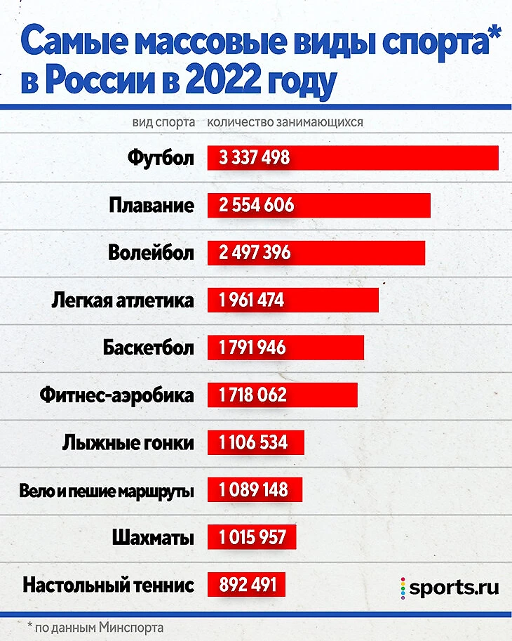 • Самым массовым видом спорта в России с безнадежным отрывом остается футбол – им занимаются 3,337 млн человек. В топ-5 по сравнению с 2021-м без изменений – кроме футбола здесь плавание, волейбол, легкая атлетика и баскетбол.