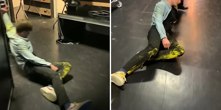 В середине пасодобля под санудтрек из «Холодного сердца» на сцену выбежали три человека: парень с баннером, девушка с сухой краской (которую тут же разбросала) и еще одна девушка – она все это снимала на телефон.