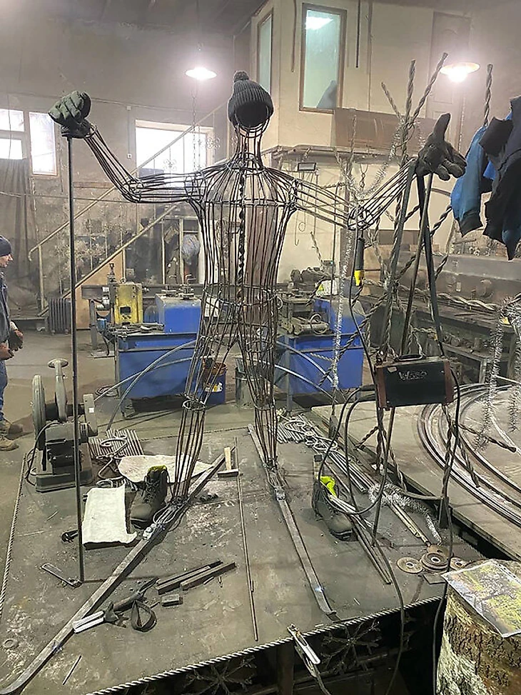 Начали делать – снежинка, постамент. Помогали с этим и стажеры. Когда делали скульптуру, приглашали мастера, который режет камни – он много подсказывал. Самому приходилось позировать – взял в прокате ботинки, палки, старые лыжи. А как иначе? Даже когда животное делаешь, сначала лепишь его из пластилина. По памяти не получится.