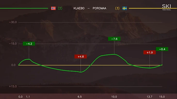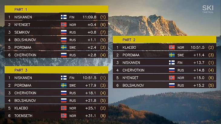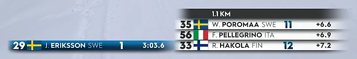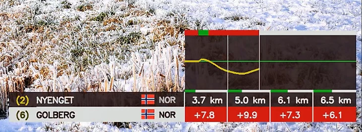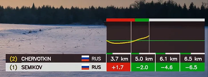 На ней одновременно отображается не более четырёх фамилий, а часто – лишь две. Если прохождение отсечки интересующим зрителя лыжником не было показано, то, чтобы узнать его результат, нужно внимательно рассматривать графику в течение нескольких следующих минут в поисках нужной строчки. При этом положительный исход совсем не гарантирован, в том числе для главных фаворитов гонки (см. таблицу из предыдущей части разбора).